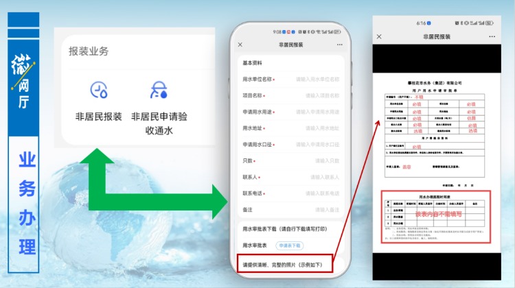 用戶(hù)可在報(bào)裝業(yè)務(wù)版塊中申請(qǐng)獲得用水。進(jìn)入報(bào)裝業(yè)務(wù)版塊,下載用水審批表,按照示例圖片,完善表格內(nèi)容,再拍照上傳,填寫(xiě)好相關(guān)信息及附件,提交預(yù)約后,由后臺(tái)工作人員接單,進(jìn)入辦理流程,流程完結(jié),告知申請(qǐng)人是否滿(mǎn)足接水條件,完成報(bào)裝申請(qǐng)。