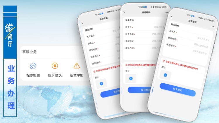 客服業(yè)務(wù)版塊主要是針對(duì)報(bào)修報(bào)漏,只要提交相關(guān)信息,工作人員會(huì)及時(shí)與用戶(hù)取得聯(lián)系進(jìn)行處理。“微網(wǎng)廳”已開(kāi)通投訴建議通道,對(duì)用戶(hù)提出的投訴和建議,將會(huì)第一時(shí)間進(jìn)行回復(fù)和處理,同時(shí)歡迎大家對(duì)身邊的違章用水現(xiàn)象進(jìn)行舉報(bào)。