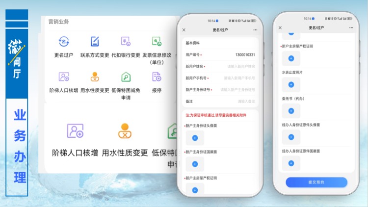 以更名過(guò)戶(hù)為例,用戶(hù)點(diǎn)擊更名過(guò)戶(hù)功能按鈕,進(jìn)入提交資料界面,按照頁(yè)面提示,填寫(xiě)相關(guān)信息和拍照上傳附件,提交預(yù)約,后臺(tái)管理人員審核通過(guò),便完成更名過(guò)戶(hù)辦理,用戶(hù)無(wú)需再到營(yíng)業(yè)大廳線(xiàn)下辦理任何手續(xù)。